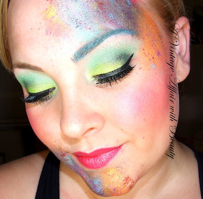 Stargazer (Purple), Cancun(Aqua Blue), Lemondrop (Yellow), Spitfire(Orange), Rumors(Pink & Cheek color), darkness falls (Dark Blue), Caynne (Red) splattered on face!